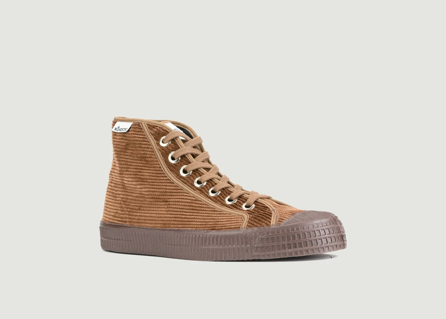 High-top sneakers in brown corduroy, tone-on-tone lace under 6 metal eyelets, logo labels sewn on the front tongue and on the side, dark brown vulcanized natural rubber sole. Handmade vegan shoes.