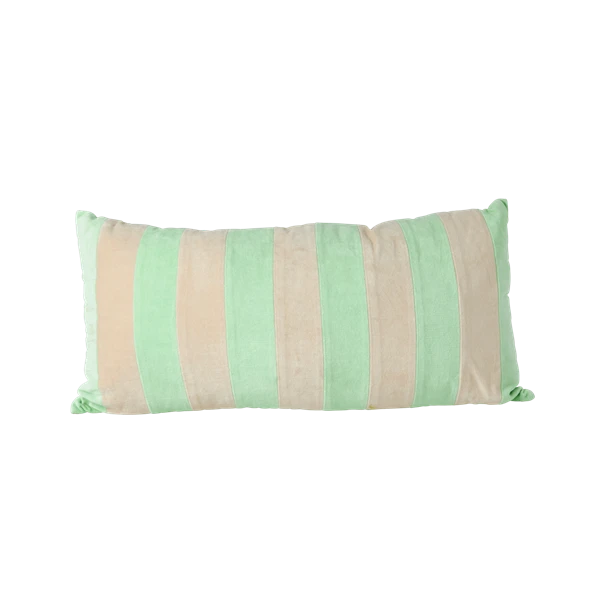 Large, beautiful pillow in velour with funky stripes and contrast color piping. The backside is in solid colored canvas fabric. This pillow will for sure decorate in your living room or on the terrace! The pillow measures L80 x W40 cm.