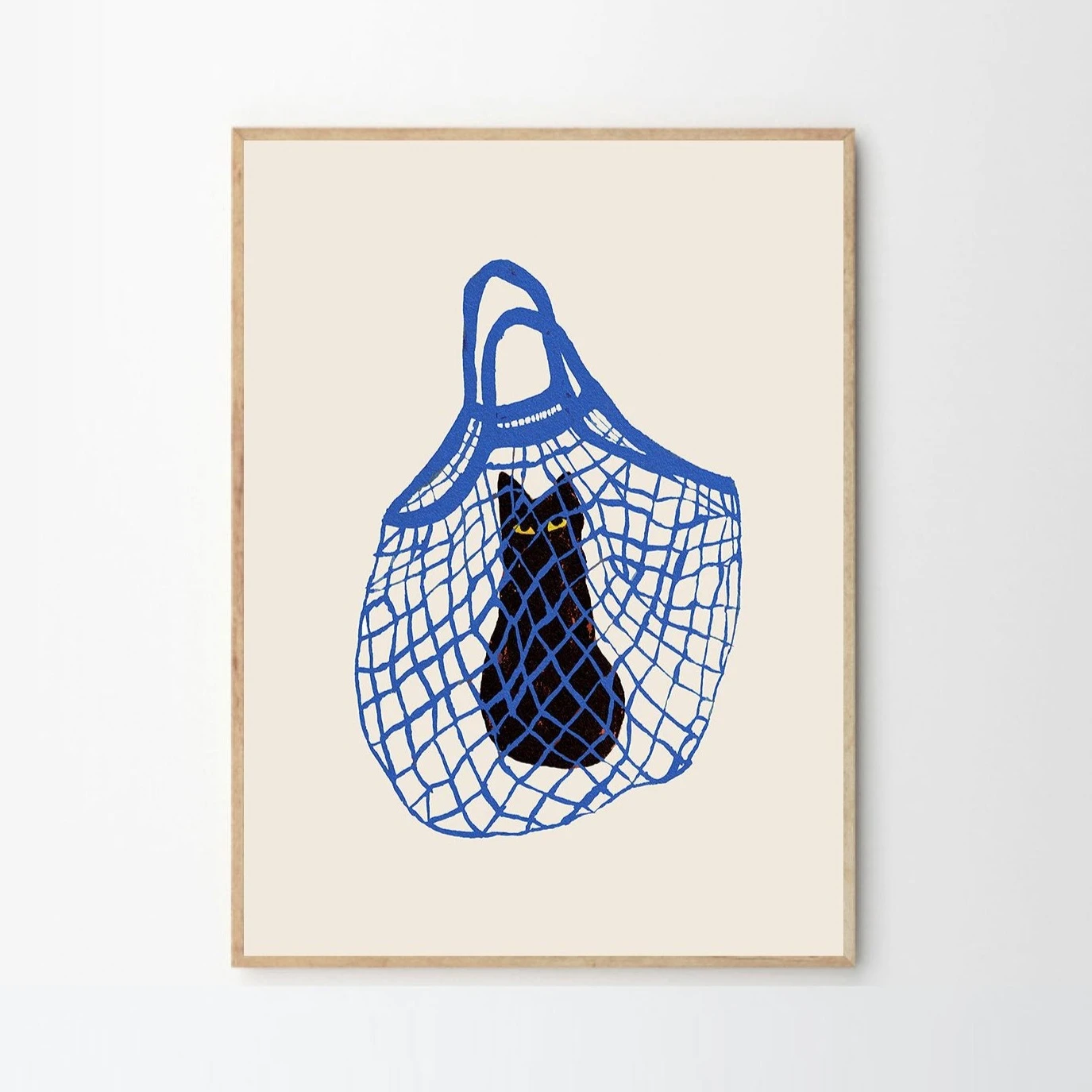 Art prints are the perfect way to elevate the look of any scheme. The Artist Chloe Purpero Johnson has captured character and charm in the form of this illustration of a black cat in a blue string bag.